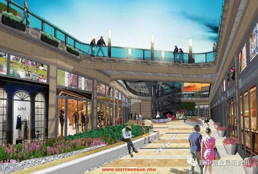 内部采用中庭+内街式的空间布局把自然光大面积引入室内。大型休闲广场、步行街内部走廊和天桥等建筑形式被灵活的加入到商业项目中